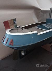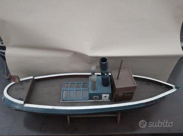 Modellino di un battello d'epoca (anni 50 /60), realizzato in legno e costruito nei minimi dettagli. Dotato di un motore a batteria, timone regolabile, luci in cabina, decorato a mano. Imbarcazione originale, conservata, da collezione. Mis. lungh. cm 70. Per info 340 6203846 o WhatsApp.