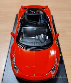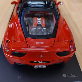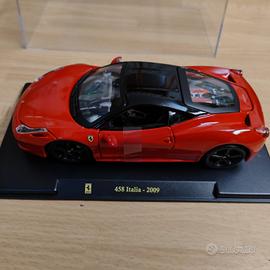 Modellino della Ferrari 458 Italia anno 2009 in scala 1:24 prodotto da Bburago, prodotto ufficiale con licenza Ferrari (come da ologramma presente sulla base), montato su una base espositiva personalizzata con il nome del modello ed è protetto dalla sua teca in plexiglass originale. Il modello è fedele all'originale in ogni minimo dettaglio: portiere laterali apribili per ammirare gli interni, cofano posteriore trasparente con la riproduzione del motore, abitacolo con cruscotto, volante logato, sedili sportivi, carrozzeria in metallo con verniciatura Rossa Corsa brillante, fari dettagliati e pneumatici in vera gomma. Il modellino è pari al nuovo ancora con i sigilli sulle portiere.