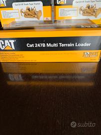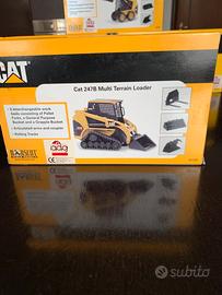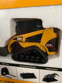 Vendo modellino minipala cingolata CAT 247 B scala 1/32 in metallo con cingoli in gomma, attacco rapido , con accessori, benna mordente per tronchi, benna std e forche.