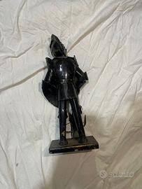Miniatura artigianale in metallo raffigurante un balestriere medievale in armatura completa, con scudo crociato e balestra. Realizzato con cura e dettagli realistici, è montato su base