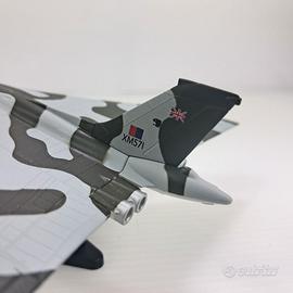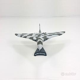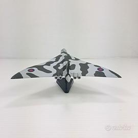 Modellino dell'aereo Avro Vulcan B.2, uno degli aerei più iconici della Guerra Fredda, famoso per la sua inconfondibile configurazione ad ala a delta. Realizzato in scala 1:234, il modello mostra una livrea mimetica a chiazze grigio scuro e verde oliva su fondo grigio chiaro, tipica degli esemplari impiegati dalla Royal Air Force negli anni ’60 e ’70.