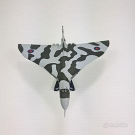 Modellino dell'aereo Avro Vulcan B.2, uno degli aerei più iconici della Guerra Fredda, famoso per la sua inconfondibile configurazione ad ala a delta. Realizzato in scala 1:234, il modello mostra una livrea mimetica a chiazze grigio scuro e verde oliva su fondo grigio chiaro, tipica degli esemplari impiegati dalla Royal Air Force negli anni ’60 e ’70.