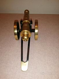 Modellino di Cannone completamente in ottone con bocca orientabile e ruote a raggi girevoli , riproduzione di cannone ad avancarica dell’epoca napoleonica. Soprammobile o fermacarte vintage realizzato negli anni 40. Lunghezza totale 20 cm larghezza 6 cm .