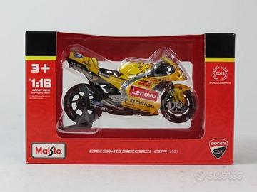 Vendo modellino in scala 1:18 della Ducati Desmosedici GP 2023 di Francesco Bagnaia, replica ufficiale Maisto. Il modello riproduce la livrea celebrativa gialla usata durante il Mondiale 2023, anno in cui Bagnaia ha conquistato il titolo di Campione del Mondo MotoGP.