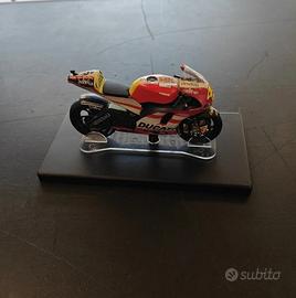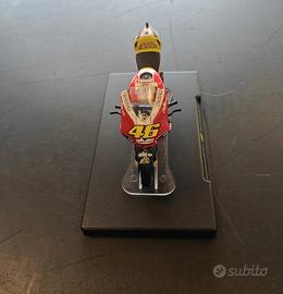 Modellino da collezione della moto Ducati Desmosedici GP11 di Valentino Rossi, anno 2011. Il modellino è in ottime condizioni ed è esposto su un supporto trasparente. - Scala: Non specificata - Marca: Ducati - Pilota: Valentino Rossi - Anno: 2011 - Include basetta espositiva