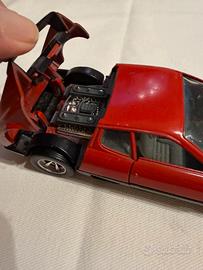 Il modello è un Polistil in scala 1/24 della Ferrari 308 GTB, prodotto in Italia negli anni ’70-’80. Il codice visibile sul retro MI-76367T (o MI-76367T/MI-76367) corrisponde a una variante classica rossa con dettagli come portiere apribili, cofano motore apribile con motore dettagliato in metallo/plastica, interni in grigio/nero, scarichi doppi e spoiler posteriore nero tipico di certi esemplari Polistil di quel periodo.