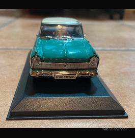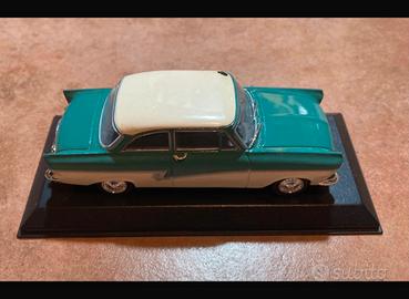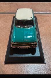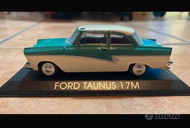 Modellino da collezione Ford Taunus 17M, colore verde con tetto bianco, completo di base nera con targa identificativa.