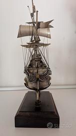 splendido modellino anni 80 di galeone Jolly Roger Peter Pan in argento 800, peso 610gr (solo galeone), peso con piedistallo 890gr.