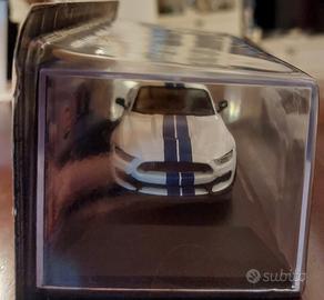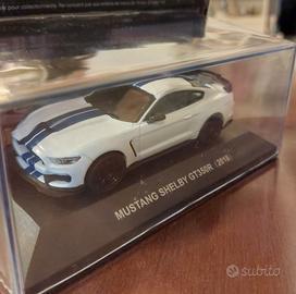 vendita modellino da collezione in scala 1:43 della potente Mustang Shelby GT350R del 2016. Il modello è nella classica colorazione bianca con strisce racing blu, completo di alettone posteriore nero e cerchi sportivi.