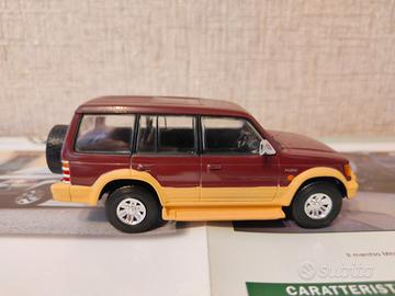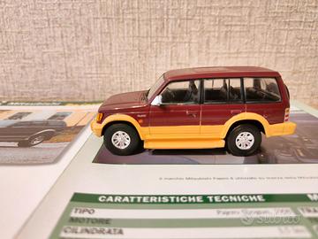 Modellino da collezione in scala 1:43 della Mitsubishi Pajero compreso di scheda con storia e dati tecnici di questo modello.