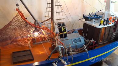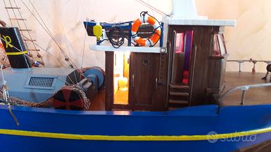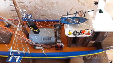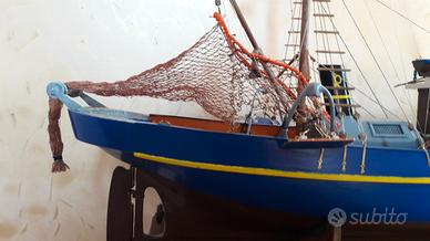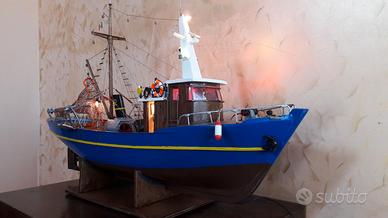 Modellino peschereccio, dimensioni 90x57x27cm, con reti, accessori pesca, luci di via e illuminazione cabine e coperta. Completo di trasformatore. Spedizione da concordare in quanto tra imballaggio e corriere non garantiscono l'integrità. Preferibile ritiro in zona.