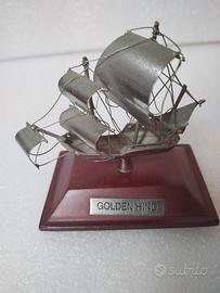 Modellino in metallo che riproduce l'iconica nave di Sir Francis Drake, la Golden Hind. Poggia su una base di legno con una targhetta che ne indica il nome.