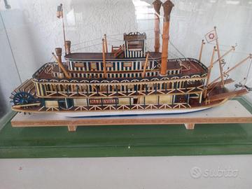 modellino vintage nave Mississippi, fatto artigianalmente in legno. Completo di teca in vetro.