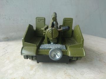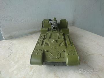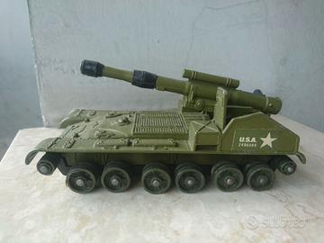 Modellino originale Dinky Toys n. 654 “155mm Mobile Gun”, prodotto nel 1973. Riproduzione in metallo pressofuso del carro armato dell’esercito U.S.A., con cannone orientabile, torretta girevole e ruote funzionanti. Verniciatura verde militare con decal originali ancora presenti. Buone condizioni generali, con lievi segni del tempo ma completo in ogni parte. Ottimo pezzo da collezione per appassionati di Dinky e modelli militari anni ’70.