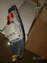 Modellino peschereggio vintage, perfetto, con scatola originale. barca giocattolo in plastica, HIS, Hong Kong, metà del XX secolo. Circa 30 centimetri, funzionante a batterie