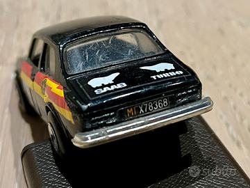 Modellino Polistil auto rally Saab 99, Saab turbo, forse del 1977 dal rilievo sul fondo.