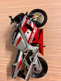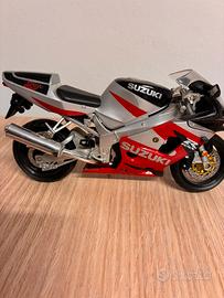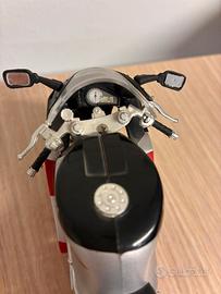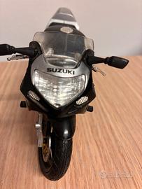 In vendita un dettagliatissimo modellino statico in scala della leggendaria Suzuki GSX-R 750. Il modello è rifinito nella classica e iconica livrea sportiva argento e rossa, con dettagli neri. Caratteristiche Principali: • Modello: Suzuki GSX-R 750 (iconica serie SRAD/K1, verificare l'anno esatto per precisione). • Colore: Livrea bicolore Argento e Rosso, con serbatoio nero e scritte "SUZUKI" bianche e rosse ben definite. Logo "GSX-R" sulla carena anteriore e "750" sul codino. • Dimensioni: Lunghezza complessiva di circa 18 cm. Questo lo rende un pezzo da esposizione di dimensioni perfette, né troppo piccolo né troppo ingombrante. • Condizioni: Usato, ma eccellentemente conservato (come visibile dalle foto dettagliate). • La vernice è lucida e le decalcomanie sono integre e nitide. • Nessuna parte mancante evidente o danni strutturali. • I pneumatici in gomma sono in ottime condizioni con battistrada dettagliato. • Cavalletto laterale funzionante e stabile (come mostrato in foto 5). • Dettagli di Pregio: • Cruscotto dettagliato con strumentazione leggibile e indicatori (vedi foto 2). • Catena di trasmissione metallizzata e corona posteriore ben riprodotte (vedi foto 1). • Dischi freno forati con pinze anteriori color oro (vedi foto 0 e 5). • Scarico cromato lucido. • Specchietti retrovisori integri (spesso fragili in questi modellini). • Faro anteriore trasparente e fanale posteriore rosso (vedi foto 3 e 4).