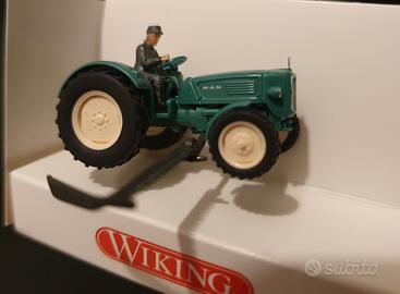 Vendo modellino di trattore MAN con falciatrice. Marca WIKING. Scala 1:87. Originale. Tutto in materiale plastico. Gomme in materiale gommoso. Ruote girevoli. Asse anteriore basculante. Falciatrice basculante. Lunghezza cm 4