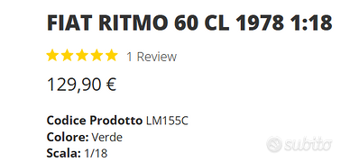 FIAT RITMO 60 CL - MODELLINO IN SCALA 1:18---- ANCORA IMBALLATA E CON SCONTRINO DI TINY CARS DI VIA CENISIO. VENDO PERCHE' HO TROVATO NEL FRATTEMPO LA STESSA MA BIANCA COME LO ERA LA MIA PRIMA MACCHIA.. LA RITMO APPUNTO.