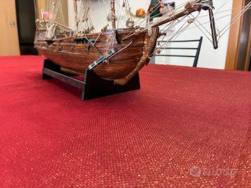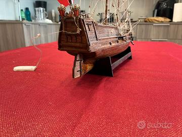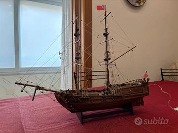 galeone inglese, fatto a mano in legno con aggiunta di luci led, misura 50 cm in lunghezza 40 cm altezza e cm. 13 larghezza, colore del fasciame dell'epoca come da foto. Preferenza ritiro in loco previa visione.