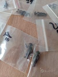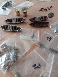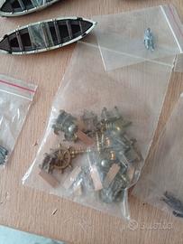 Vendo Questi oggetti! Sono componenti di un kit di modellismo navale, Nello specifico si possono distinguere: Barcacce o scialuppe: Modellini di imbarcazioni a remi, tipiche dei vascelli storici, cavalluccio marino, bandiera Jolly Roger Piccole botti (barili) e altri elementi decorativi in miniatura. Soldatini o personaggi in scala In blocco25 € /singole 3€