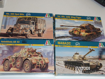Vendo scatole di figurini,mezzi,aeri,elicotteri e materiale sfuso in scala 1/35 e 1/72,sia 2^ Guerra Mondiale(alleati, tedeschi,italiani regio esercito,x^mas,bersaglieri,giapponesi,personsle raf,israeliani,forze speciali,terroristi, americani)sia Moderni. Varie marche: Dragon, Italeri,Airfix,Waterloo 1815,Ceasar Miniatures,ICM,RCR,MAC,confezioni di colori Vallejo, materialescenografico. Il prezzo di vendita è solo indicativo, i prezzi variano tra le 7€ per la scala 1/ 72 , 10 € figurini 1/35, 20€-30€ mezzi 1/35 mezzi,14 € vernici. Più spese di spedizione tramite Posta Ordinaria. A chi è i teressato invio lista completa materiale .