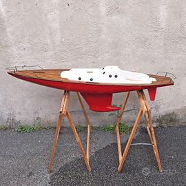 Grande modello vintage (ritengo anni '80) in vetroresina per barca a vela RC, SOLO SCAFO con deriva piombata e progetto per alberatura e vele (non compresi).