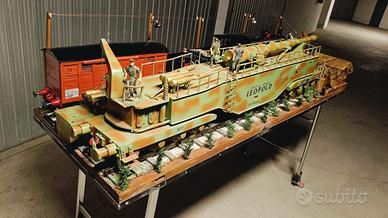 cannone Leopold Krupp montato su binari, affiancato da locomotiva FS746 GR13 con tandem portacarbone e vagone portaproiettili.
