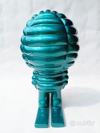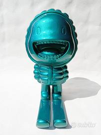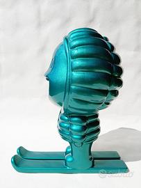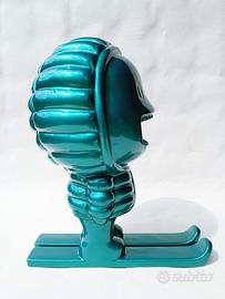 Simpatico gadget pubblicitario mascotte del piumino Moncler prodotto per allestimento boutique ma in questo caso mai esposto in negozio come pubblicità. Realizzato in resina di un particolare colore verde effetto cromato, in condizioni eccellenti con segni di usura impercettibili e radi da cercare con la lente di ingrandimento. Oggetto raro da collezione, specialmente in queste condizioni che rasentano la perfezione. Altezza circa 31cm.