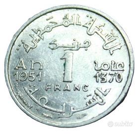 Moneta da 1 Franc del Marocco, con data 1951 .