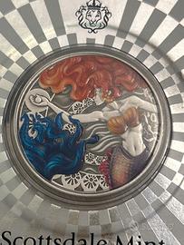 Il rovescio della moneta mostra una splendida sirena in dettagli vivissimi: i suoi capelli rosso fuoco e la coda iridescente brillano di colori vibranti mentre si protende verso una perla luminosa. I contrasti tra blu e arancione creano un senso di movimento e magia, come se la moneta fosse una finestra su un mondo sottomarino incantato. La finitura antichizzata esalta la profondità del design, accentuando ogni vortice d’acqua, ciocca di capelli e dettaglio dello sfondo corallino dell’oceano. Sul dritto, lo stemma ufficiale di Samoa ne conferma l’autenticità e lo status di moneta a corso legale garantita dal governo.