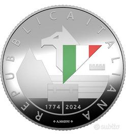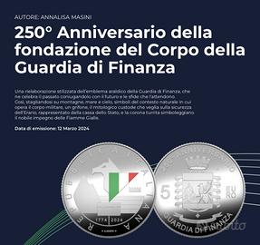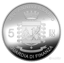 Moneta in argento proof del peso di 18g, valore nominale 5€, emissione speciale per celebrare i 250 anni dalla fondazione della Guardia di Finanza, il più antico corpo di polizia italiano e tra i più antichi del mondo. Edizione limitata, con una tiratura di soli 7000 esemplari, andata esaurita già dopo un'ora dall'immissione in vendita da parte della Zecca dello Stato.