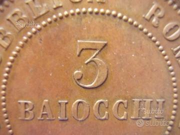 Moneta da 3 baiocchi, anno 1849, II Repubblica Romana. Conservazione qFDC, rame, colpetti sul bordo, zecca di Bologna. Scambio brevi mani, non spedisco.