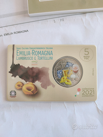 Vendo moneta 5 euro fdc emessa a luglio 2021 Lambrusco e Tortellini della serie "Cultura Enogastronomica Italiana" Emilia Romagna.