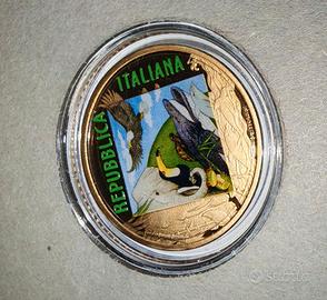 Composizione a colori di alcune specie animali rappresentative della fauna terrestre che convivono in armonia con l’ambiente. In alto e a destra, “REPUBBLICA ITALIANA”; in esergo, il nome dell’autore “PETRASSI”. Moneta con elementi colorati.