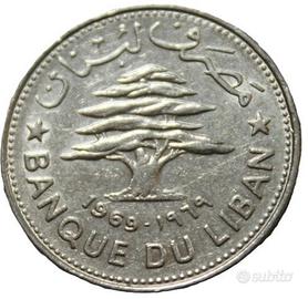 Moneta da 50 Piastre del Libano, coniata tra il 1969 . Raffigura un albero di cedro, simbolo nazionale.