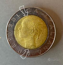 Moneta 500 lire bimetallica datata 1988 con errori di conio: Dimensioni interne Data tagliata R tagliata C tagliata