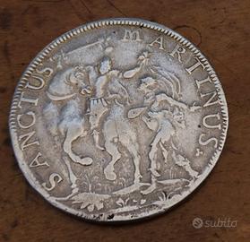 Scudo di Lucca: Antica moneta del 1750 in argento con rappresentati su una faccia lo stemma cittadino e sul retro la rappresentazione della storia di San Martino. di San Martino