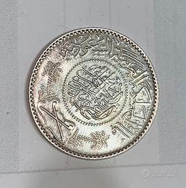 Moneta d'argento da 1 Riyal dell'Arabia Saudita, emessa durante il regno di Ibn Saud (il primo re dell'Arabia Saudita). Dritto: Iscrizione araba in stile thuluth all'interno di un'opera in pietra. Legenda circolare, due palme ai lati di uno scudo con due spade incrociate all'interno. La data visibile sulla moneta (١٣٥٤) corrisponde all'anno islamico 1354 dell'Egira, che equivale al 1935 d.C. Argento al 97% peso 11 granmi circa.