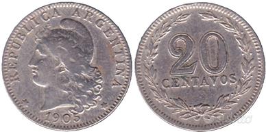 Moneta da 20 centavos della Repubblica Argentina, coniata nel 1905.