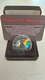 Moneta d'argento da 1oz. La moneta raffigura l'immagine più iconica dell'album "the dark side of the moon", viene fornita in cofanetto insieme ad un certificato di autenticità ed un portamonete. Una moneta da collezione perfetta per tutti gli amanti dei Pink Floyd. Tiratura limitata a soli 100 pezzi in tutto il mondo.