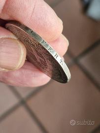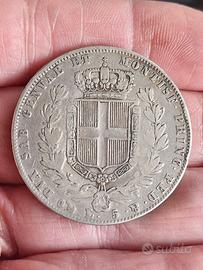 Moneta in argento da 5 Lire del Regno di Sardegna, coniata nell'anno 1844.