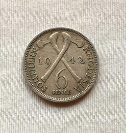 n.1 moneta Rhodesia, 6 pence 1942 argento 0,925, dritto George VI King Emperor PM, rovescio 6 pence Southern Rhodesia, peso 2,83.