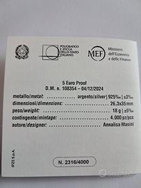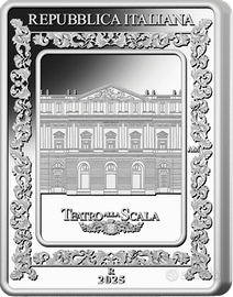 moneta d'argento da 5 euro in argento 925 emessa nel 2025 dalla Repubblica Italiana come parte della Collezione Numismatica dedicata alla lirica italiana,. Soggetto: Celebra l'opera "Norma" di Vincenzo Bellini e il Teatro alla Scala di Milano, Un omaggio senza tempo all’arte lirica italiana e in particolare a Norma, opera capolavoro di Vincenzo Bellini, attraverso la raffigurazione del Teatro alla Scala di Milano, che ne ospitò la prima rappresentazione nel 1831 e l’affascinante ritratto della cantante Giuditta Pasta, interprete della prima rappresentazione e musa ispiratrice del compositore. (non emessa per la circolazione)