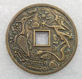 Moneta commemorativa di origine cinese con un foro quadrato al centro. Il design presenta creature stilizzate e simboli.