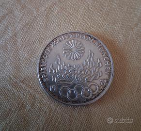 Moneta d'argento da 10 Marchi della Repubblica Federale di Germania: coniata nel 1972 per commemorare i XX Giochi Olimpici di Monaco. Rraffigura il fuoco olimpico sopra i cinque cerchi e reca l'iscrizione "SPIELE DER XX. OLYMPIADE MÜNCHEN 1972". Composizione: Argento Peso: 15,5 grammi. Diametro: 32,5 mm. Bordo: Riporta l'iscrizione "CITIUS ALTIUS FORTIUS"
