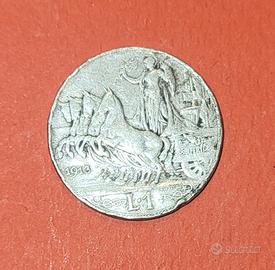 Moneta da 1 lira del 1913 in condizioni di usura, presenza segni del tempo come graffi e ammaccature, nonostante ciò mantiene bene la sua bellezza, è una moneta rara e ricercata ideale per arricchire una collezione personale.