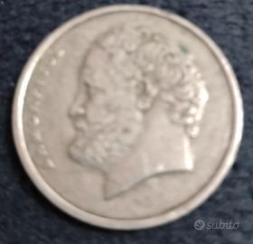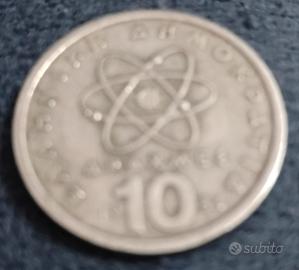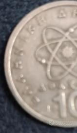 Moneta da10 dracmegreche del1984. Valuta: Dracma greca (GRD), valuta della Grecia prima dell'euro. Valore attuale: Il valore di conversione teorico è di circa 0,03 Euro, tuttavia il valore numismatico può variare a seconda dello stato di conservazione. Caratteristiche: La moneta raffigura un modello atomico ed è composta da una lega di rame-nichel.