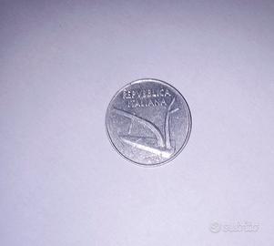 Questa moneta, in lega leggera di alluminio, presenta sul dritto due spighe di grano incrociate con il valore facciale “10”, mentre sul rovescio troviamo il celebre disegno dell’aratro con la scritta “Repubblica Italiana” e l’anno di conio.