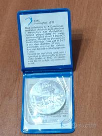 Moneta da 10 Marchi (Markka) finlandesi in argento commemorativa del campionato europeo di atletica leggera di Helsinki 1971, con custodia originale.